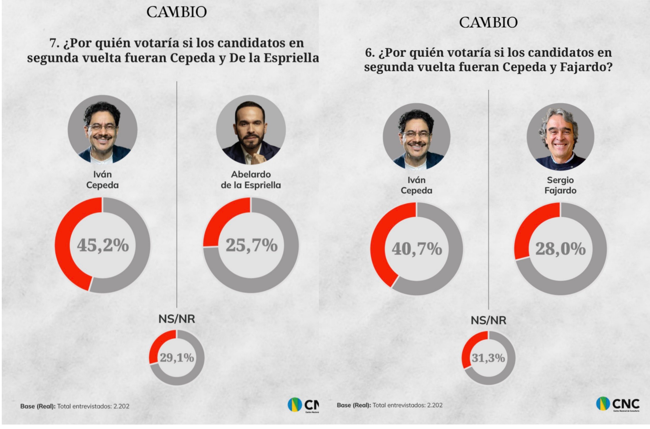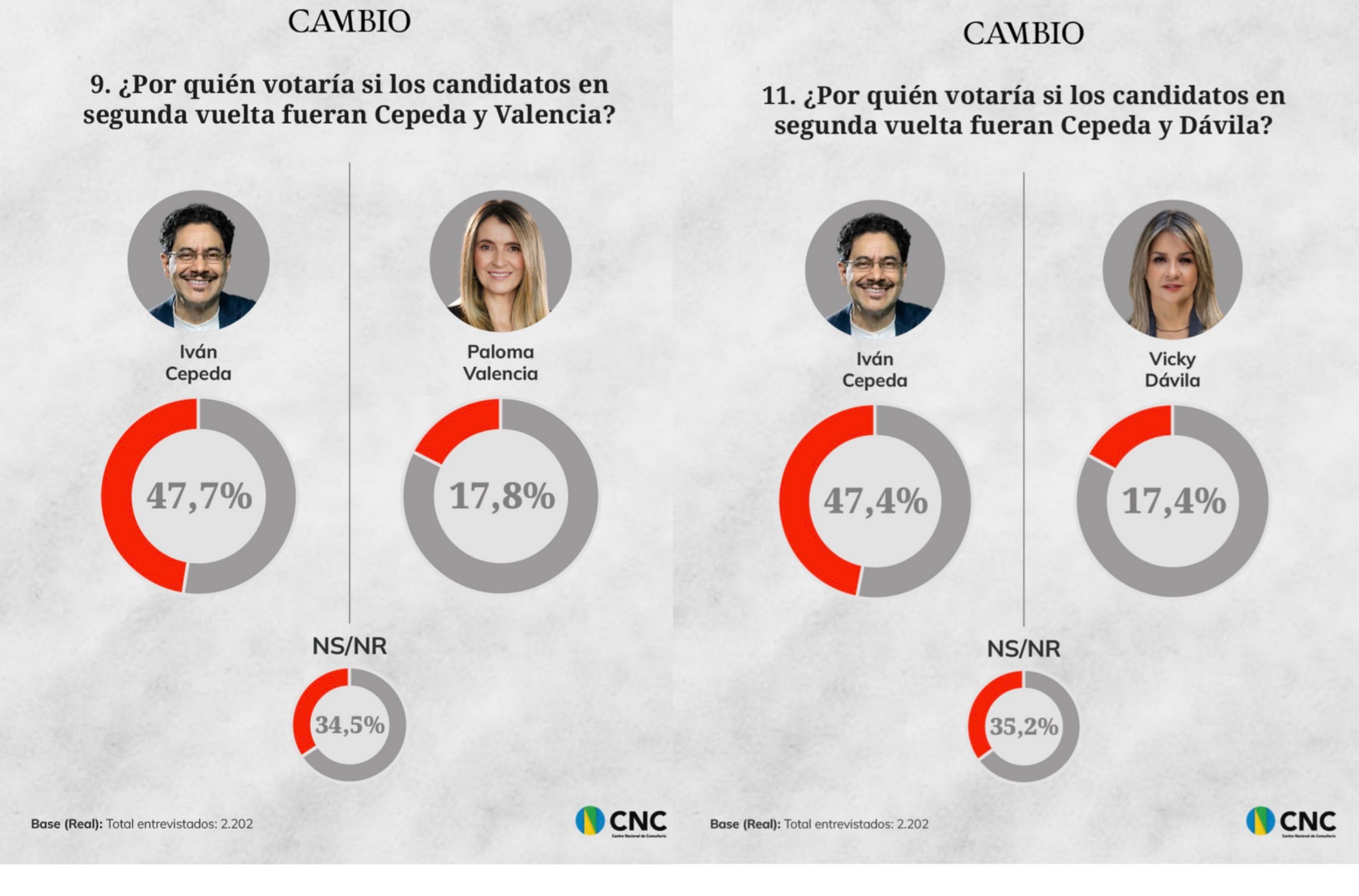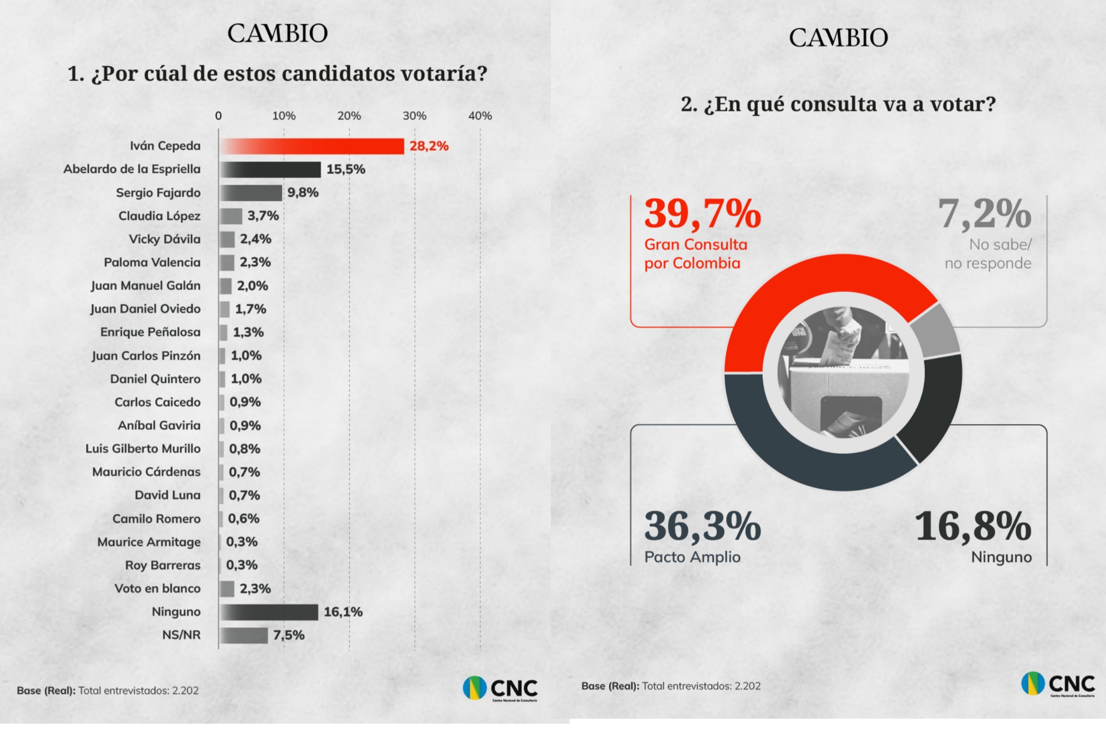 La revista Cambio publicó este domingo 25 de enero, los resultados de la encuesta contratada con el Centro Nacional de Consultoría CNC, para medir ente otros, la intención de voto a la presidencia de la República de Colombia.